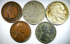Us coin lot with a wheat cent, an Indian head cent, a buffalo nickel, and more.