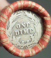 TIGHTLY CRIMPED RED BANK WRAPPED ROLLS OF WHEAT CENTS WITH BARBER DIMES SHOWING