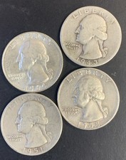 Lot of Four (4) Washington Quarters, Years 1940-1949, 90% Silver, Free shipping!