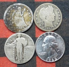 4 USA Silver Quarter Type Lot, Seated, Barber, Standing, Washington, 1853...
