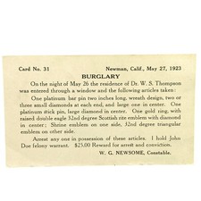 1923 Reward Postcard for Burglary Antique Ephemera Postmarked California Sheriff