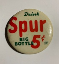 DRINK SPUR Soda Pop 5 Cents 12oz Bottle Advertising Button Pin PINBACK Vintage