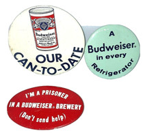 Lot of 4 vintage Budweiser advertising pinback pin / buttons - our can-to-date