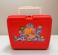 Vintage 1980's Red Plastic Lunchbox - Elf Clockmaker Graphic Retro Toy Storage