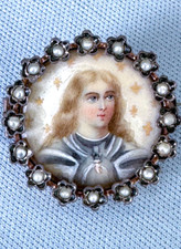 19C Hand Painted France King Louis IX Enamel Portrait Brooch Gold Silver Pearls