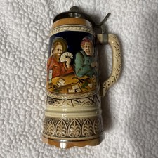 Vintage German Lidded Stein Music Box - Card Players & Castle Relief -