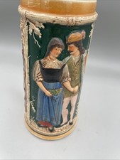 German Beer Stein Dancing Couple Relief Lidded Ceramic Tall Collectible
