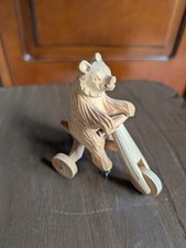 Vintage USSR Bear Toy Wood Carved: Tricycle Figurine, Moveable Parts