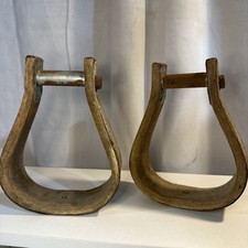 Pair Of Antique Wooden Western Saddle Stirrups Cowboy Decor Aged Metal Bent Wood