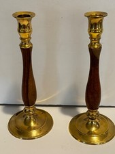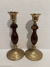 Mid Century Modern Wood and Brass Candlesticks Set of Two 9.5"
