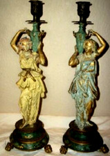 FRENCH Art Nouveau BRONZE Ladies CANDLE HOLDERS 1890s Chippy Paint 1890s ANTIQUE