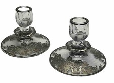 Pair Of Vintage/Antique Footed Glass Candlesticks Silver Overlay,Filigree Roses