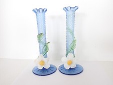 Antique Victorian Pair Glass Candle Sticks W/ Applied Flower & Leaves Vintage