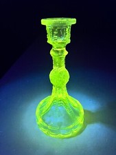 Vintage Pair Art Deco Vaseline Glass Yellow Candlestick Holders 6 1/4”
