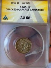 INDIAN CENT 1863 ANACS AU 58+++MINT ERROR CRACKED PLANCHET WOW COIN LOOKS UNC