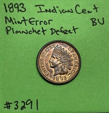 1893 Indian Head Cent 1c BU Mint Error Obverse Planchet Defect Or Struck Thru