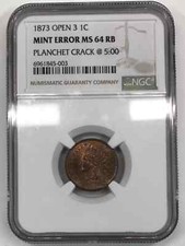 1873 Open 3 Indian Head Cent NGC MS-64 RB *MINT ERROR PLANCHET CRACK @ 5:00*