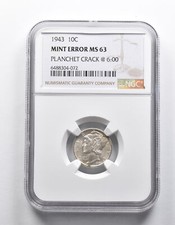 Mint Error MS63 1943 Mercury Dime Planchet Crack @6:00 NGC *1892