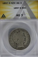 1897-S .50 ANACS AG 3 Barber Liberty, Half Dollar, Lady Liberty Half