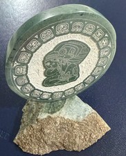 Mayan Calendar Guatemalan Jade Jadeite Disk Hieroglyphs With Raw Jade Base