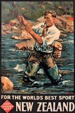 FLY FISHING "WORLDS BEST SPORT" ADVERTISING TRAVEL POSTER NEW ZEALAND FISHERMAN