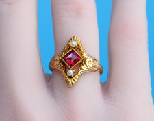 Superb Antique / Early Vintage 12K Yellow Gold Ring w/ Red Gemstone & Pearls