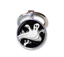 Spooky Halloween Goblins Ghost - Handmade ROUND Glass Pendant Keychain KEY RING