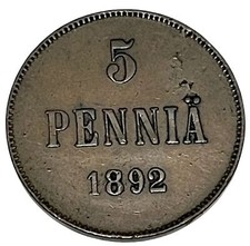 KEY DATE 1892 Finland 5 Pennia Low Mintage KM# 11 Rev Lamination Error Lot A5-97