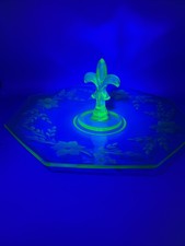 Antique Fostoria Uranium Glass Server Sandwich Tray Fleur De Lis Handle