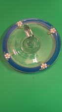 Vintage Hand Painted Glass Cake Plate – Blue & Gold Enamel Florals, 12" Center