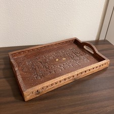 Vintage Hand Carved Wooden Serving Tray Brass Inlay India Floral 12" x 8"