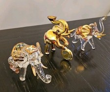 3 Vintage Elephants Figurines Murano Style Glass Crystal Gold Plated
