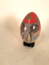 Vintage Art Glass Egg on Wooden Base with Elephant on Both Sides, 5" t