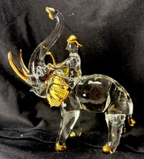 Vintage Glass Elephant Figurine with Rider Hand-Painted Gold Trim Beaded 4”x4”