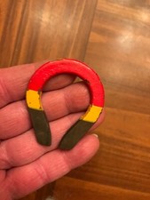VINTAGE 1950s TOY HORSESHOE SHAPED 2 3/8" LONG RED YELLOW METAL MAGNET