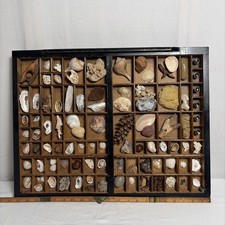 Antique Printer’s Drawer Seashell Collection Mounted Seashells ,rocks,wood,Etc!
