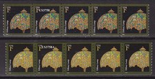 Scott Stamp # 3758, (1c) Miss-cut TIFFANY LAMP, Strip of 5 w/Plate # MNH