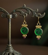 Museum Earrings Leaf Antique Flower Tree Green CZ VTG Carved Intaglio Court Boho