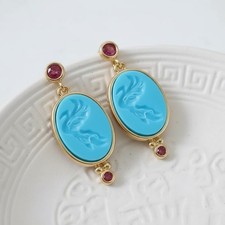 Museum Intaglio Bird Phoenix Earrings Swan Gold CZ Greek Turquoise VTG Wings Art