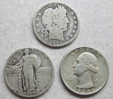 1892 Barber, 1926 Standing Liberty , 1932 Washington 25c; Lot of Three Coins.