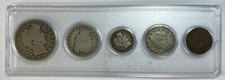 1908 Birth Year Set of 5 Coins, Barber Half, Quarter, Dime, V Nickel, Indian 1C