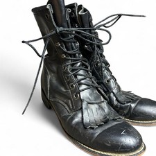 Size US 7 Black Antique Eyelet Block Heel Lace Up Calf Boot