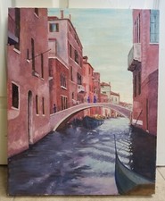 Original Mid Century Venice Canals Gondola Canvas Painting Muted Pink Blue Tones