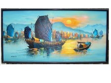 Mid Century M Leung Abstract Oil Painting Chinese Junks in Harbor Skyline Port