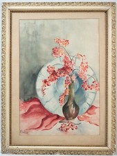 Vtg Mid Century M.L. Gibbons Still Life Watercolor Painting of Flowers in Vase