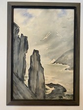 M. Schaefer Mid Century Watercolor Seascape Coastal Cliffs Gulls Signed Framed