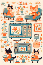 1960s Cute Mid Century Modern Cat Family Art Print m12