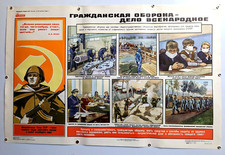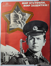 cold war propaganda_ large poster / helmet red star / ak-47 assault rifle / 1979