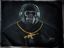 Gorilla w/ Headphones and AK-47 Necklace - Large (30x40) Oil Painting on Canvas