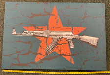 cold war propaganda nice poster / helmet red star / ak-47 assault rifle / c1976